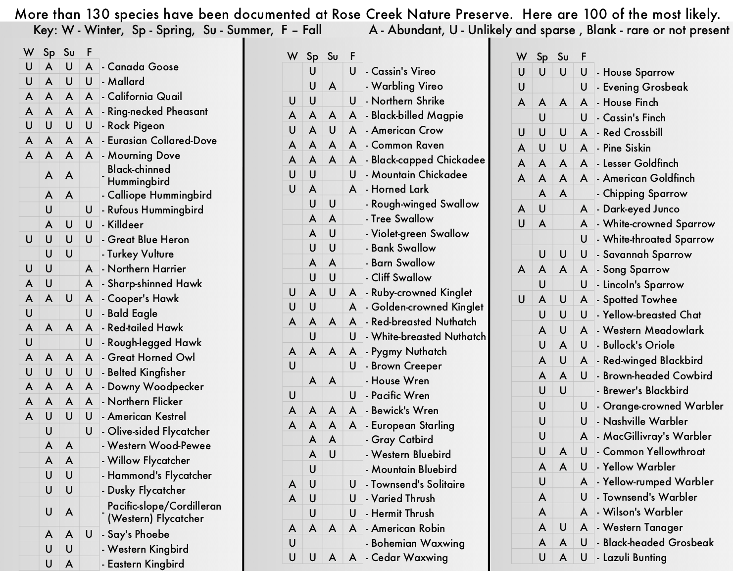 Each bird is listed as abundant (A), unlikely and sparse (U), or not present (blank) for each seasons. Data from eBird’s Rose Creek Preserve hotspot was used to select the top 100 species and estimate the likelihood of their presence in each season.