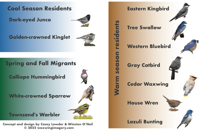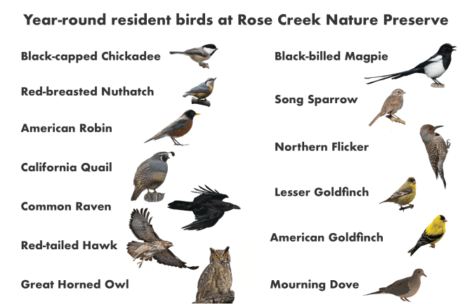 Birds are organized by the time of year they are likely to be seen and only represent a fraction of the species that could be found. Many images were captured at Rose Creek and others were sourced from the Waxwing Imagery collection or the Macauley Digital Library. Images were modified to remove distracting backgrounds for a clean look at the field marks of each bird.
